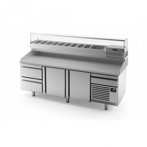 Masa pizza cu doua usi si 2 sertare nerefrigerate + vitrina ingrediente pentru 11 cuve GN 1/4, cu lungimea de 230 cm. Sertarul de deasupra motorului este refrigerat. Fabricate cu materiale de cea mai inalta calitate din domeniul aparatelor de racire. Infrico ofera solutii adaptate perfect nevoilor clientilor sai. Tehnologia si inovatia crescuta de-a lungul anilor, calitatea certificata si fiabilitatea produselor, recomanda produsele Infrico pentru orice domeniu de alimentatie publica.