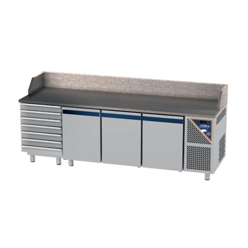 Linia de blaturi Dalmec Pizza este sinonima cu eleganta, fiabilitatea, robustetea si usurinta în utilizare. Blaturi frigorifice prevazute cu o unitate de racire „monobloc” clasa 5 („tropicalizata”); mediul extern de lucru poate atinge temperaturi de pâna la + 40/42°C cu 65% umiditate relativa. Structura interioara si externa este realizata din otel inoxidabil. Usi cu inchidere automata si pozitie fixa de deschidere la 100°, garnitura magnetica usor demontabila, margini rotunjite pentru curatare usoara si optima. Izolatie de 60 mm din poliuretan injectat sub presiune inalta fara prezenta CFC sau HCFC. Panoul de comanda lateral include masca speciala care gazduieste controlerul digital impreuna cu butoanele de pornire/oprire si butonul de pornire a iluminatului intern. Detectarea temperaturilor prin intermediul sondelor NTC. Refrigerare ventilata cu gaz R290. Dezghetarea si evaporarea automata a apei de condens prin serpentina din otel inoxidabil AISI 316L. Modelul standard prevede ghidaje interne în forma de „U” pe care gliseaza rafturile/tavile usor demontabile, montanti verticali detasabili pentru o curatare rapida si optima. Picioare din otel inoxidabil reglabile pe înaltime. Cablul de alimentare este furnizat fara priza.